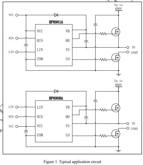 The BP6901A/BP6908A is a high voltage, high speedhalf-bridge pre-driver for power MOSFET and IGBT.It has inputs for both high side and low side, and twooutput channels with internal dead time to avoidcross-conduction.